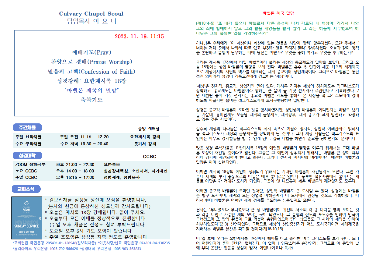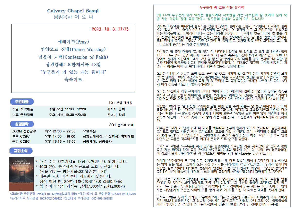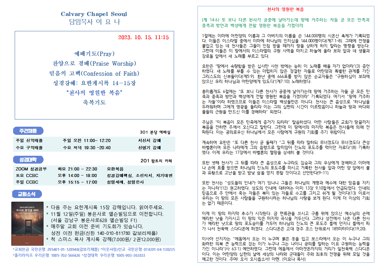 새 하늘 새 땅 새 예루살렘 (계 21:1,2) “또 내가 새 하늘과 새 땅을 보니 처음 하늘과 처음 땅이 없어졌고 바다도 다시 있지 않더라 또 내가 보매 거룩한 성 새 예루살렘이 하나님께로부터 하늘에서 내려오니 그 예비한 것이 신부가 남편을 위하여 단장한 것 같더라” 요한은 20장 11절에서 “또 크고 흰 보좌와 그 위에 앉으신 자를 보니 땅과 하늘이 그 앞에서 피하여 간 데 없더라” 증거하였다. 그러므로 새 하늘과 땅은 새로 창조된 것이다. 베드로도 현재의 땅과 온 우주가 뜨거운 불에 녹아지고 거대한 폭발로 체질이 뜨거운 불에 풀어진다고 예언하며, "우리는 그의 약속대로 의에 거하는바 새 하늘과 새 땅을 바라본다"(벧후3:10) 증거했다. “창조”(bara)는 “하나님이 천지를 창조”(창1:1)하실 ..