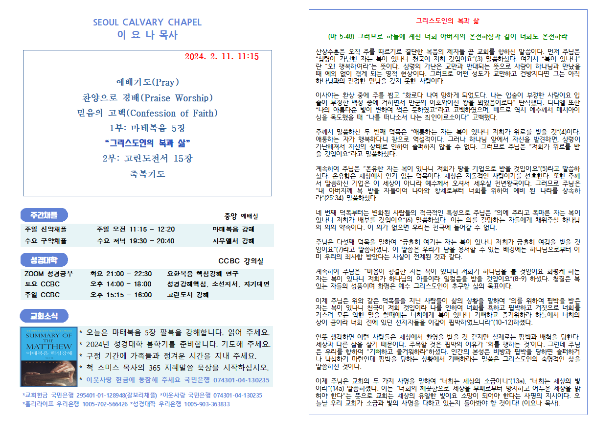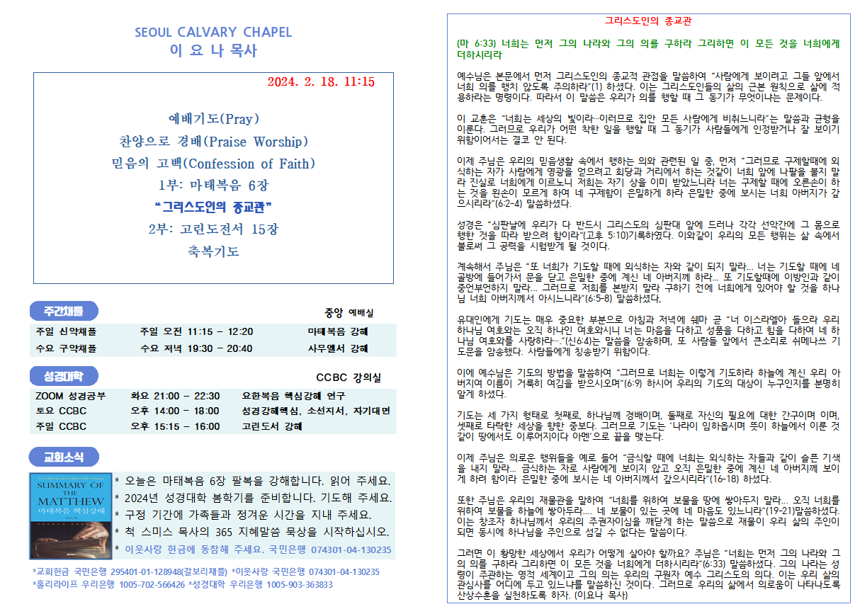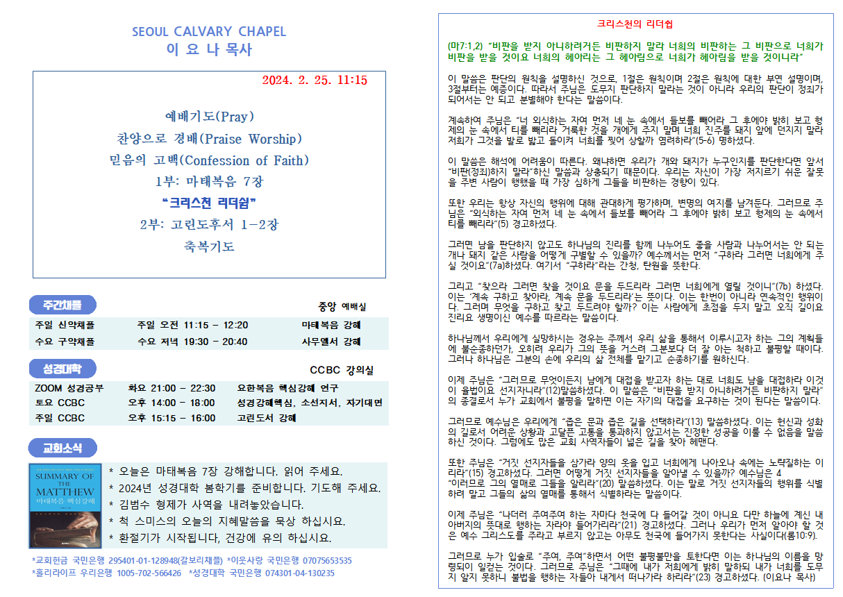 크리스천의 리더쉽 (마7:1,2) “비판을 받지 아니하려거든 비판하지 말라 너희의 비판하는 그 비판으로 너희가 비판을 받을 것이요 너희의 헤아리는 그 헤아림으로 너희가 헤아림을 받을 것이니라” 이 말씀은 판단의 원칙을 설명하신 것으로, 1절은 원칙이며 2절은 원칙에 대한 부연 설명이며, 3절부터는 예증이다. 따라서 주님은 도무지 판단하지 말라는 것이 아니라 우리의 판단이 정죄가 되어서는 안 되고 분별해야 한다는 말씀이다. 계속하여 주님은 “너 외식하는 자여 먼저 네 눈 속에서 들보를 빼어라 그 후에야 밝히 보고 형제의 눈 속에서 티를 빼리라 거룩한 것을 개에게 주지 말며 너희 진주를 돼지 앞에 던지지 말라 저희가 그것을 발로 밟고 돌이켜 너희를 찢어 상할까 염려하라”(5-6) 명하셨다. 이 말씀은 해석에..