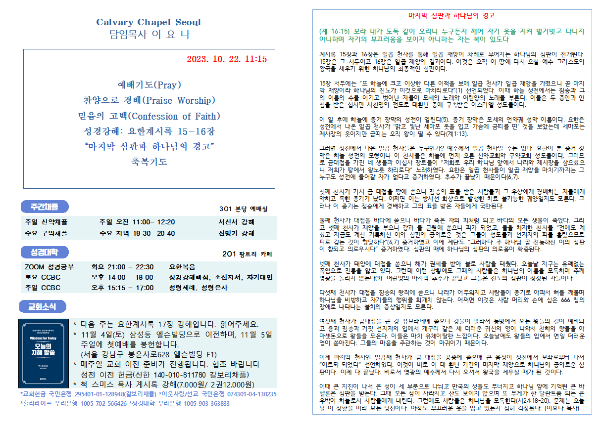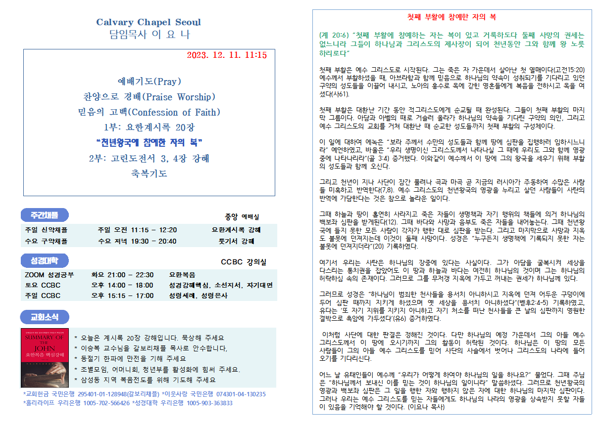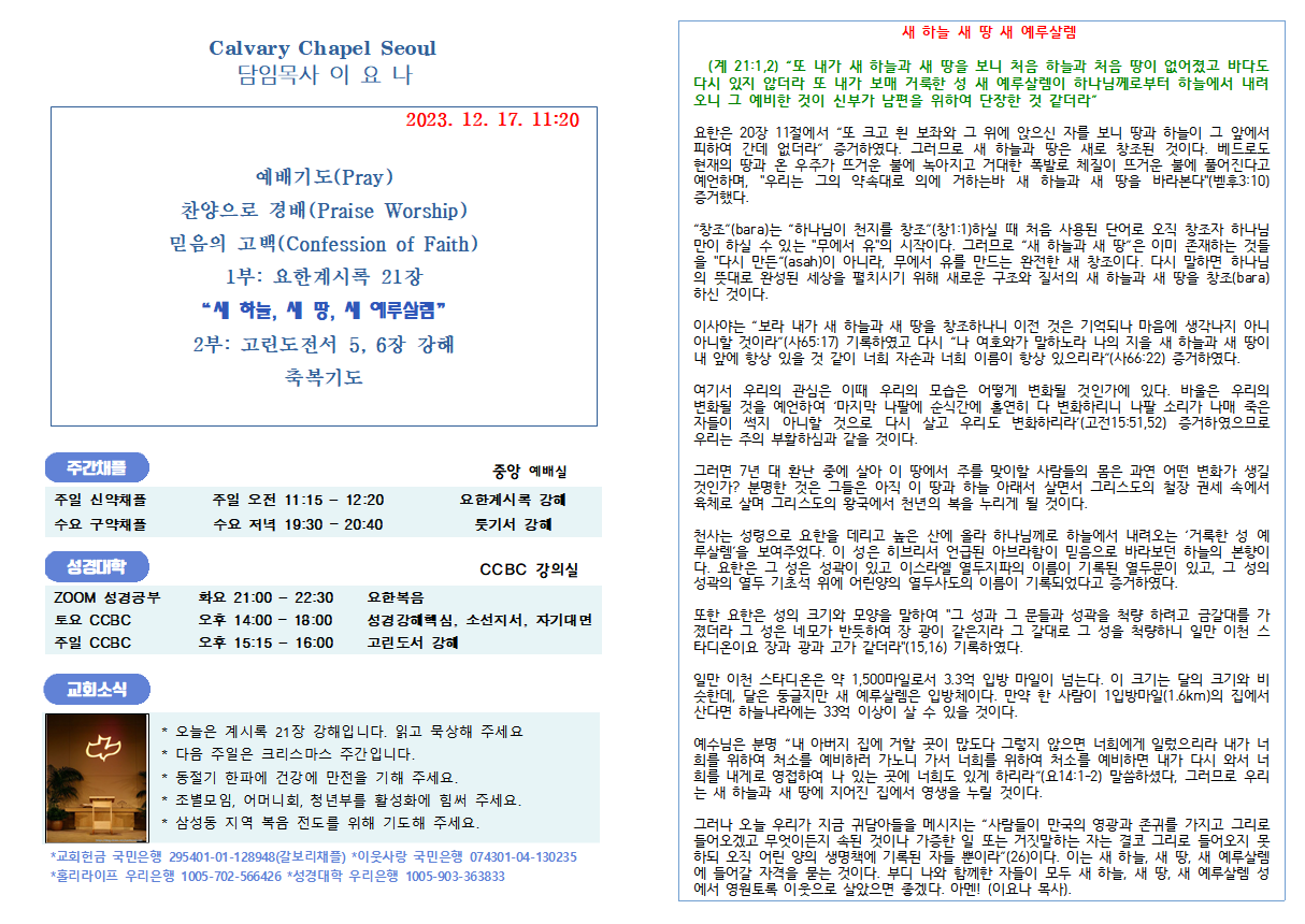 새 하늘 새 땅 새 예루살렘 (계 21:1,2) “또 내가 새 하늘과 새 땅을 보니 처음 하늘과 처음 땅이 없어졌고 바다도 다시 있지 않더라 또 내가 보매 거룩한 성 새 예루살렘이 하나님께로부터 하늘에서 내려오니 그 예비한 것이 신부가 남편을 위하여 단장한 것 같더라” 요한은 20장 11절에서 “또 크고 흰 보좌와 그 위에 앉으신 자를 보니 땅과 하늘이 그 앞에서 피하여 간 데 없더라” 증거하였다. 그러므로 새 하늘과 땅은 새로 창조된 것이다. 베드로도 현재의 땅과 온 우주가 뜨거운 불에 녹아지고 거대한 폭발로 체질이 뜨거운 불에 풀어진다고 예언하며, "우리는 그의 약속대로 의에 거하는바 새 하늘과 새 땅을 바라본다"(벧후3:10) 증거했다. “창조”(bara)는 “하나님이 천지를 창조”(창1:1)하실 ..