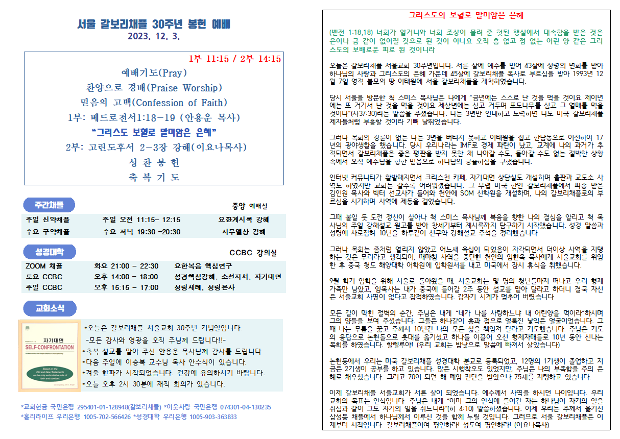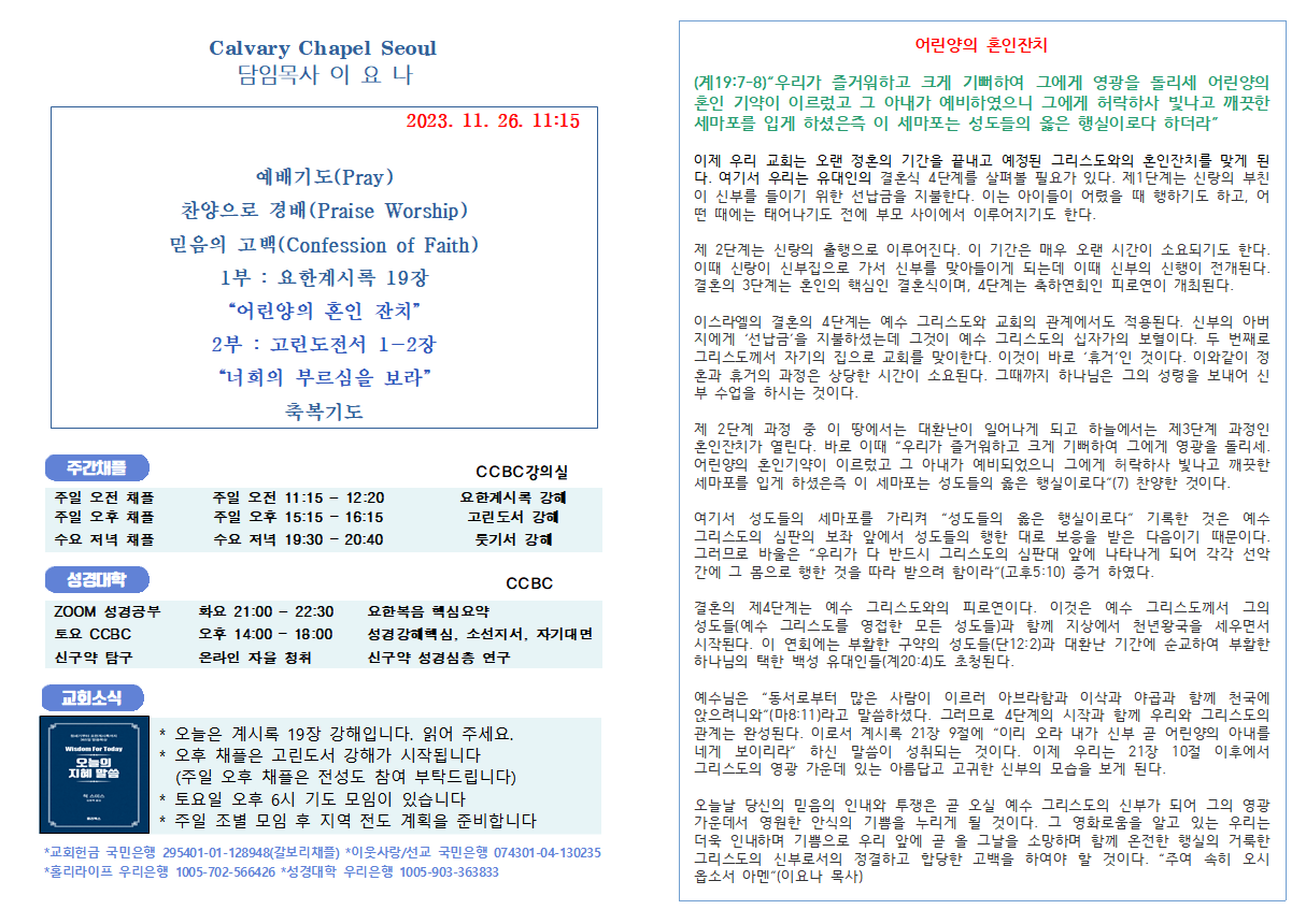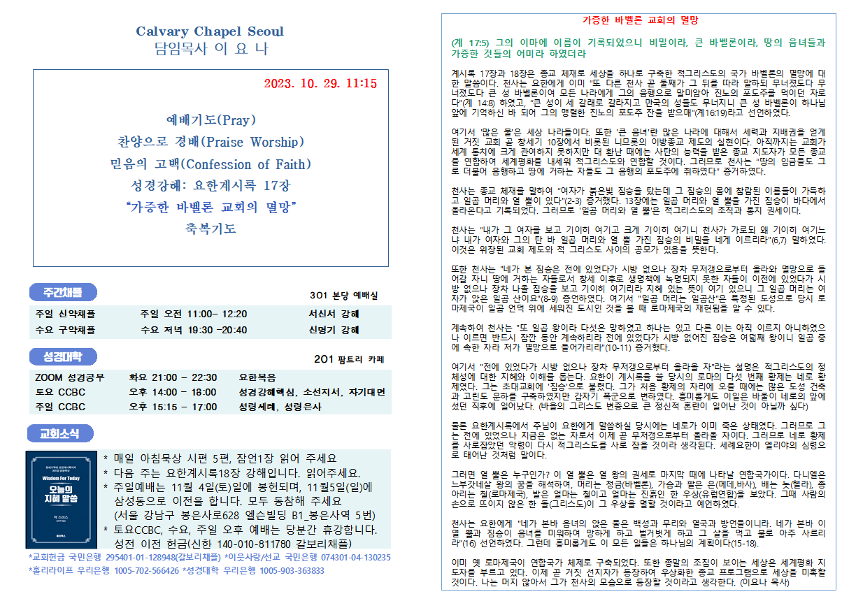 새 하늘 새 땅 새 예루살렘 (계 21:1,2) “또 내가 새 하늘과 새 땅을 보니 처음 하늘과 처음 땅이 없어졌고 바다도 다시 있지 않더라 또 내가 보매 거룩한 성 새 예루살렘이 하나님께로부터 하늘에서 내려오니 그 예비한 것이 신부가 남편을 위하여 단장한 것 같더라” 요한은 20장 11절에서 “또 크고 흰 보좌와 그 위에 앉으신 자를 보니 땅과 하늘이 그 앞에서 피하여 간 데 없더라” 증거하였다. 그러므로 새 하늘과 땅은 새로 창조된 것이다. 베드로도 현재의 땅과 온 우주가 뜨거운 불에 녹아지고 거대한 폭발로 체질이 뜨거운 불에 풀어진다고 예언하며, "우리는 그의 약속대로 의에 거하는바 새 하늘과 새 땅을 바라본다"(벧후3:10) 증거했다. “창조”(bara)는 “하나님이 천지를 창조”(창1:1)하실 ..